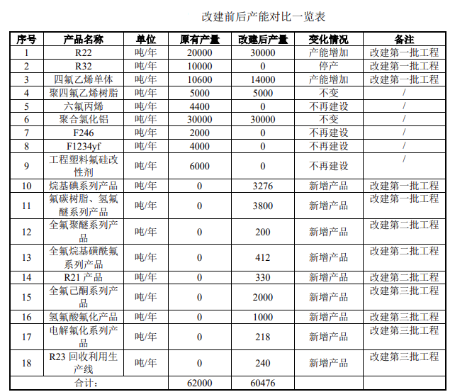 受市场影响,江西中氟对原有项目进行改建,不再建设F246、F1234yf等产品生产线,改造现有R21、四氟乙烯和R32生产线,新增烷基碘系列等产品生产线。